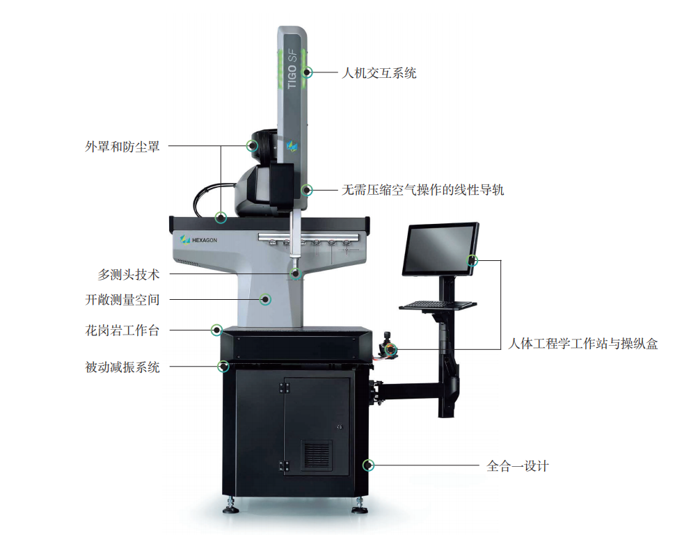 紧凑型 TIGO SF 三坐标测量设备,计算机和控制系统等均集成在底部支撑柜内,使得系统占用空间最小且易于移动