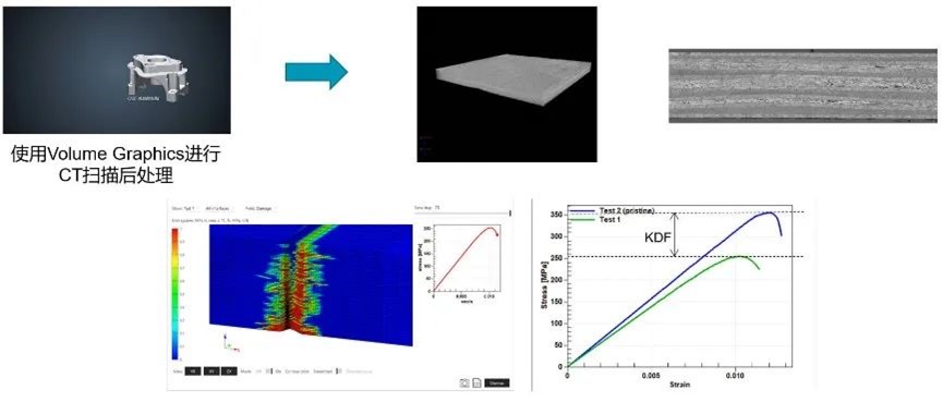 Digimat中拥有材料的固化动力学模型,可以在RVE级别研究材料固化过程,也可以与有限元分析软件进行联合仿真,实现组件级别的固化过程分析,从而帮助工程师了解制造工艺对复合材料储氢罐性能的影响,而利用Volume Graphics软件对储氢罐结构进行CT扫描的图像后处理,可以准确获取实际结构中的缺陷情况,进而结合Digimat和有限元分析软件,可以精确计算缺陷对储氢罐性能的影响
