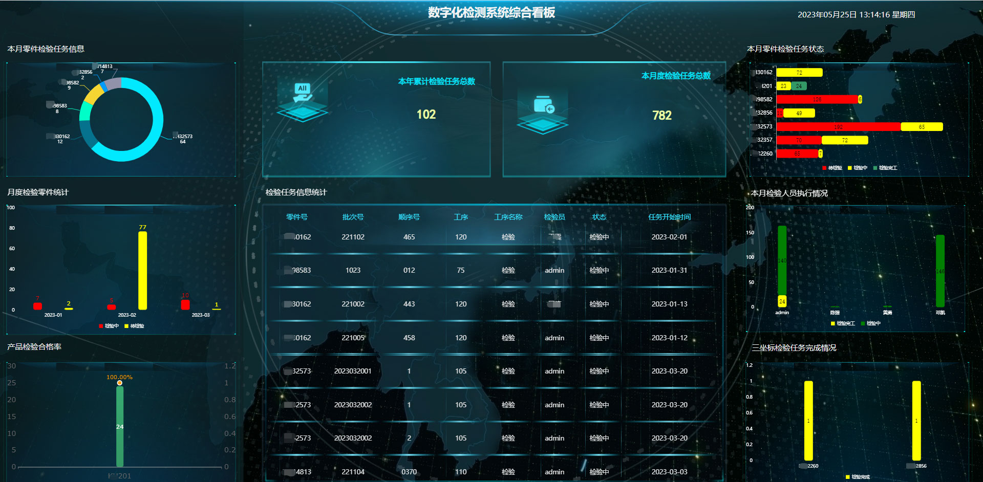 管理人员可在综合看板上,实时监控检验任务的执行情况,对任务的全过程进行监控,合理的分配检测资源,提高设备的使用效率,提升检测的整体执行效率。系统具备实时数据处理与评价,可进行检测数据实时监控、基于实时数据的SPC统计分析和超差报警功能。