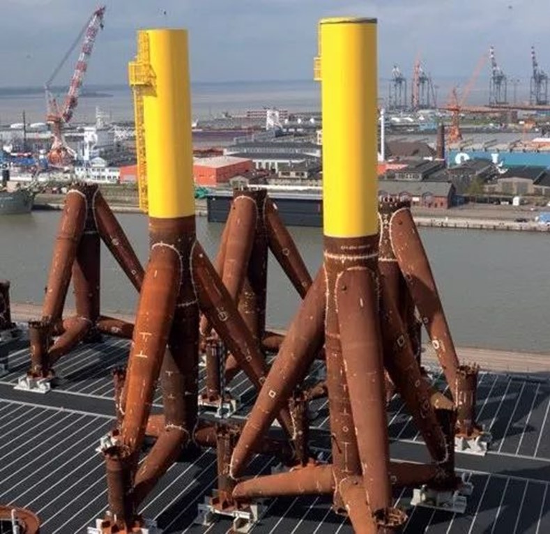较深水域的大型风力发电机需要构建在诸如三角架结构的多个基点上,三角架由大型钢管构成三个稳定的支撑基础。用在海上风力发电机上的三角架有的高达60米,重达960 吨,其结构质量和尺寸精度是制造海上风力发电机最重要的环节,也是难点环节。