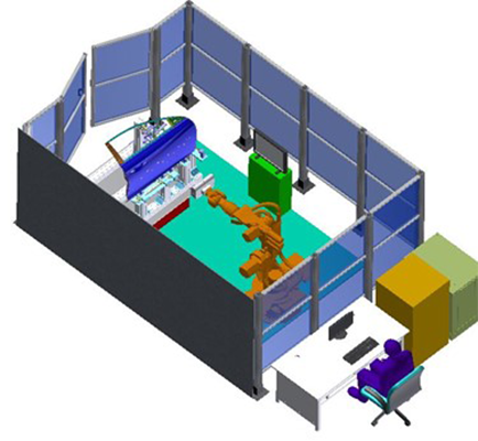 高效机器人+转台+三维光学扫描自动检测方案,包括光学测头校准板、电脑、软件,机器人,测量支架,工件,围栏,安全系统、转台、导轨等;