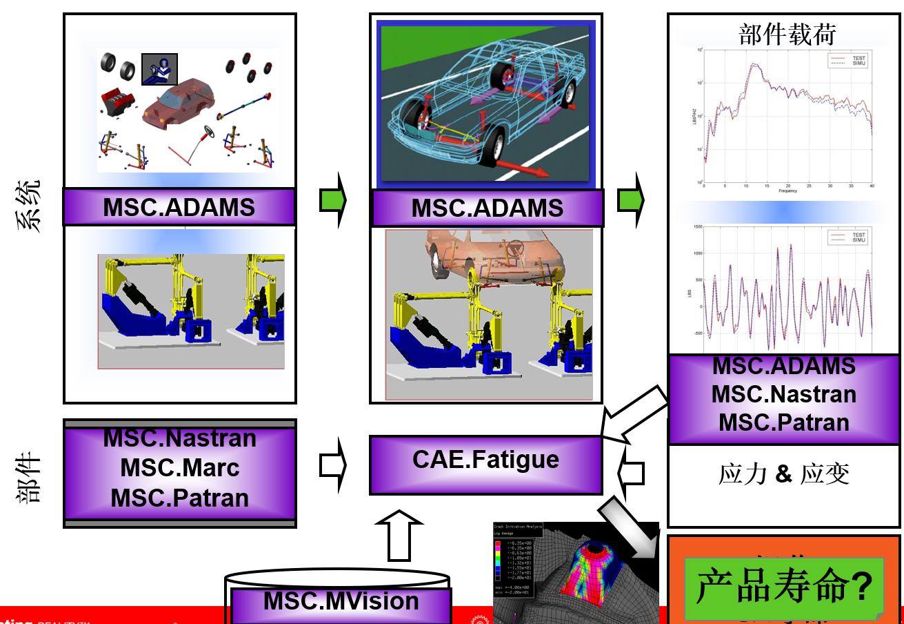 整车开发中车身、底盘零部件的强度、刚度、疲劳性能是重点领域,企业受制造成本压力和整车经济性要求,需要在保证整车性能的前提下,综合考虑车身强度、疲劳性能同时,又要减轻重量,降低制造和用户使用成本;因此,如何获取车身、底盘零部件精确受力、掌握各种典型工况,利用现有虚拟仿真技术,是保证企业快速成功开发的关键。MSC车身、底盘零部件疲劳分析方案可以为企业提供一个清晰的路线图,帮助企业实现成功开发,帮助企业实现以下内容: