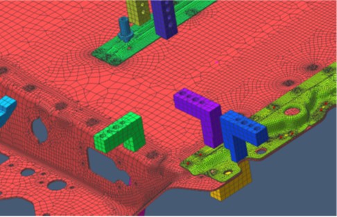 Simufact Welding软件仿真过程高度还原电池托盘焊接过程,电池托盘焊接结构件网格单独划分,焊缝位置无需节点匹配,全局全自动接触计算,无需手动定义任何接触关系。工装夹具几何数模一键式导入,高度复现实际工艺过程。