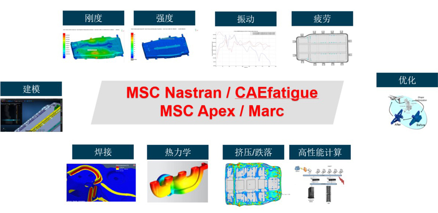 电池包开发设计中的刚度、强度、疲劳性能是重点领域,企业受制造成本压力和整车续航与经济性要求,需要在保证电池包刚度、强度和疲劳等性能同时,考虑减轻重量,降低制造和用户使用成本。使用MSC虚拟仿真技术,是保证企业快速成功开发的关键。