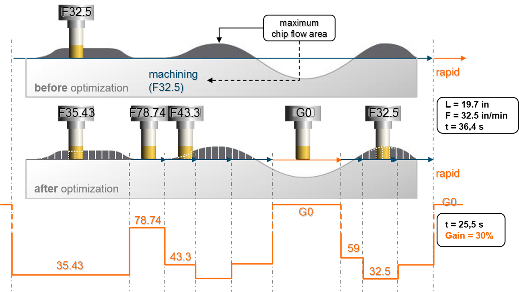 该模块它通过精确的计算和分析每次切削刀具的纵深、宽幅、角度及去除量,综合分析每个切削段的去除量后得出进给率,并且不会改变原刀具路径,最大限度地减少工具偏移问题,消除碰撞风险,并且通过分析移除材料,生成新的进料速度,实现机床与材料之间的平衡。