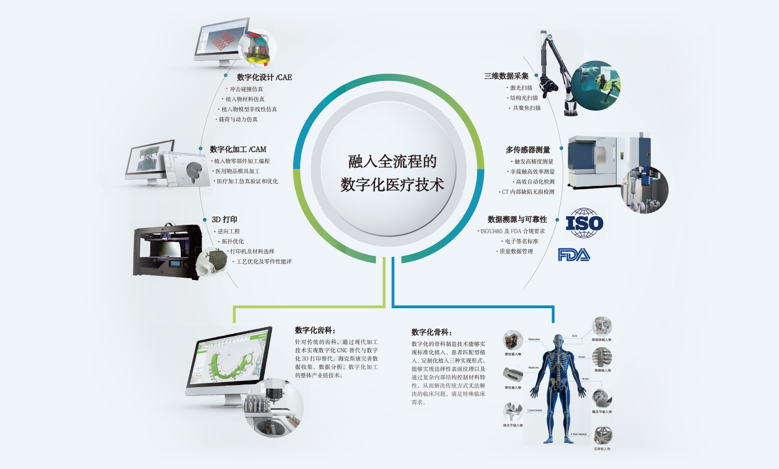 据统计,全球有超过80%的骨科植入物在设计制造过程中使用了海克斯康所提供的技术,不仅仅局限于植入物,海克斯康持续关注整个医疗行业的发展,结合多产品多方案的智能制造技术和多维创新,依托于海克斯康的多学科联合仿真、多传感器高精度测量技术、黑灯工厂数字化质量解决方案等国际领先的软硬件方案,实现产品覆盖医疗领域的设计工程、加工制造、计量检测、质量控制等全流程,致力于提升医疗科技进步,构建智能制造生态系统,赋能医疗行业数字化,通过对包含但不限于智能制造领域先进技术的重组和创新,为医疗行业提供贯穿产品全生命周期的质量提升解决方案。