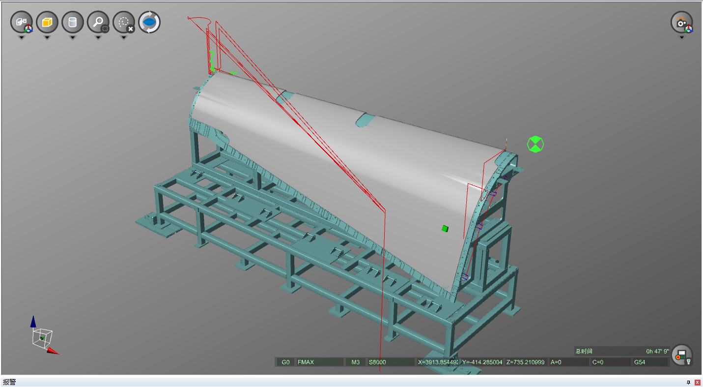 蒙皮作为飞机重要的组成部分之一,目前使用复合材料的比例越来越高,这在给飞机整体减重带来好处的同时,由于其自身特点,给加工生产带来了许多难点:首先由于其材料是复合材料,且尺寸较大,因此原材料成本高,不允许由于加工问题导致零件报废;其次机床尺寸大,附件多,价格昂贵,如果加工过程中出现机床碰撞,损失惨重。如何在确保产品质量的前提下保证安全生产,避免撞机和零件报废,提高生产效率,是加工企业追求的目标,而这个目标的达成存在一定的难度。