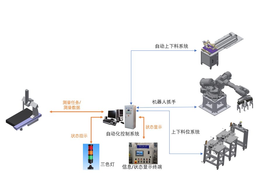 测量机(配置UPS)、恒温房、自动上下料系统、测量自动化控制系统、机器人及抓手等;