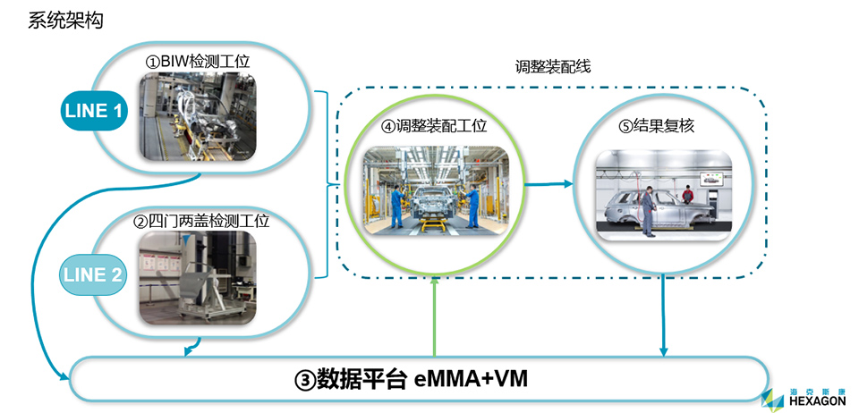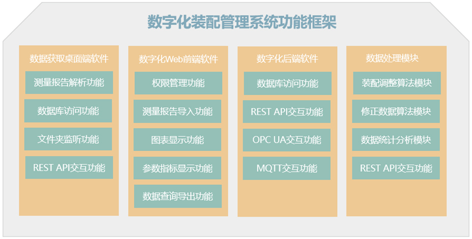汽车门盖数字化调整装配系统是基于海克斯康的Galaxy IDE基础核心平台结合先进的管理理念,所研发的数字化装配管理系统。该系统采用模块化建设,支持本地化部署和云端部署。结合具体的汽车调整装配需求,所搭建的系统功能框架如下图所示,主要包括四个模块:数据获取的桌面端软件、数字化web前端软件、后端软件和调整算法软件。