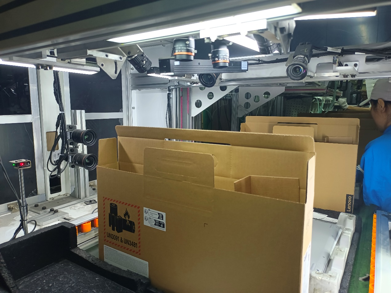 笔记本屏幕ACC Check检测设备通过前后、左右、上方多个高精度大视野相机Check shipping label与机台SN一致性、Check 包材夹页、check 适配器&电源线&触控笔、check 卡通料号、check彩盒(实际验证)、比对机台SSN(镭雕)是否与外箱配置单一致,与MES交互通讯,实现自动Check。