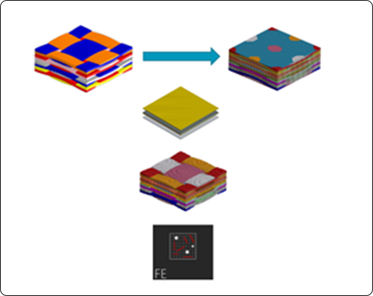 打通微观与宏观力学分析之间的壁垒,Digimat-MF基于平均场均质化模块,能够进行基体相和夹杂物相力学性能的分析以及复合材料微观形貌等细观力学分析,得到预浸料的基本力学特性,通过Digimat FE生成代表性体积单元(RVE),实现对PCB材料的微观结构及其组分的力学特性研究,通过将微观结构的力学分析结果作用于宏观结构的有限元模型上,实现多尺度的分析功能。