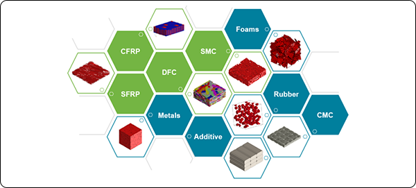海克斯康的Digimat复合材料多尺度分析建模平台能够帮助用户完成多种复合材料复杂工程分析,强度非线性失效分析、蠕变、疲劳、冲击(考虑应变率效应)、NVH(频率依赖)等,支持的复合材料类型包括:连续纤维(CFRP)、长&短纤维(SFRP)、纤维编织、针刺、晶须、颗粒、片层等增强相和包括树脂基、金属基、碳碳和陶瓷基在内的多类基体材料。Digimat提供的软件接口几乎涵盖所有主流有限元软件,能够与上述软件实现耦合分析,大幅提高相关结构的分析精度和能力。